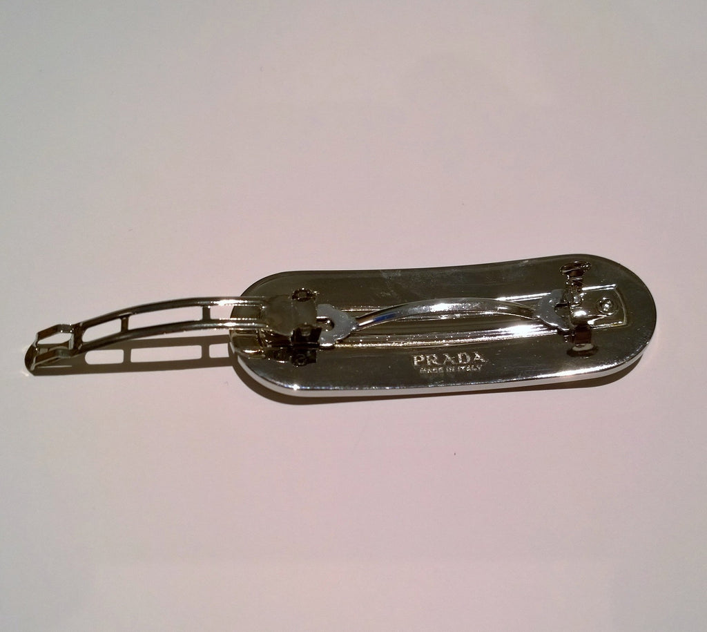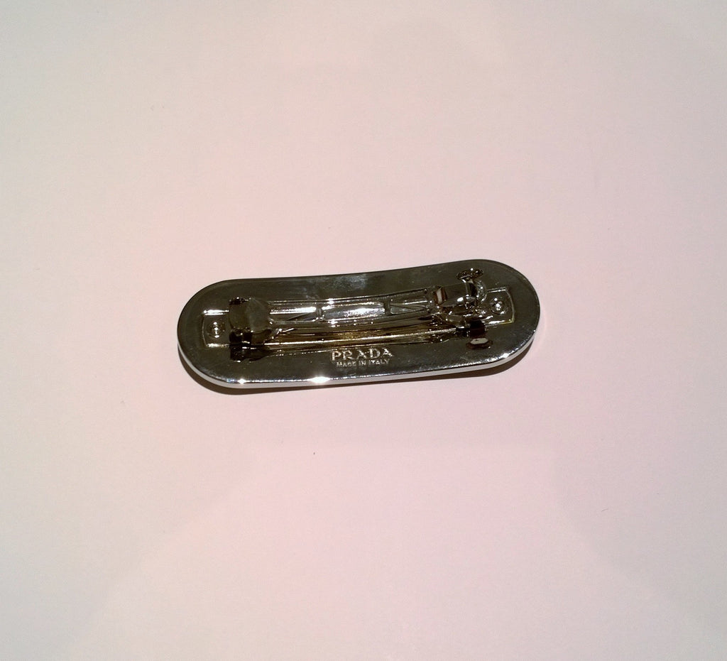 Prada logomania comes in hair accessories. This silver tone metal hair clip comes with shiny black enamel body and silver Prada logo. Snap closure. The clip comes in Prada box.